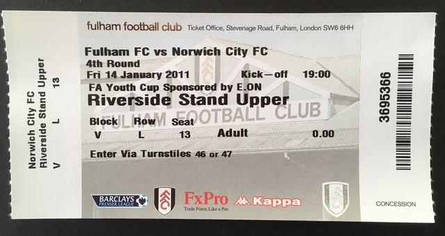 Match ticket from the Norwich City’s youth away match against Fulham, in the Football Association Youth Cup, fourth round, in 2010/11. (NWHHT:17313)