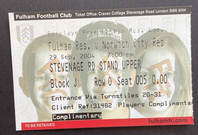 Match ticket from Norwich City’s reserves away match against Fulham, in the Barlclays Premier Reserve League (South), in 2004/5. (NWHHT:27352)