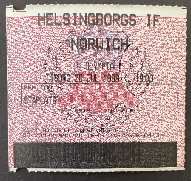 Match ticket for Norwich City’s away match against Helsingborgs Idrottsforening, in a friendly, in 1999/00. (NWHHT:21887)