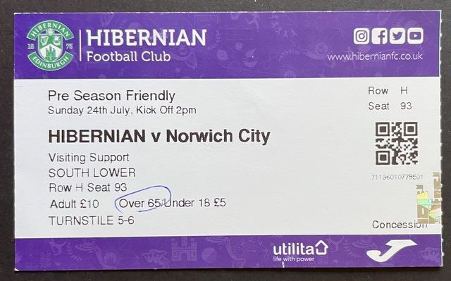 Match ticket for Norwich City’s away match against Hibernian, in a friendly in 2022/3. (NWHHT:23846)