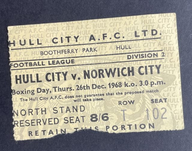 Match ticket from Norwich City’s away match against Hull City in the Football League, Division Two in 1968/9. (NWHHT:25774)
