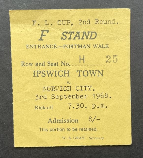 Match ticket from Norwich City’s away match against Ipswich Town in the Football League Cup, second round in 1968/9. (NWHHT:25772)