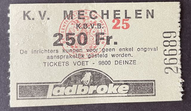 Match ticket from Norwich City’s away match against Koninklike Voetbalclub Mechelen, in a friendly, in 1994/5. (NWHHT:28451)