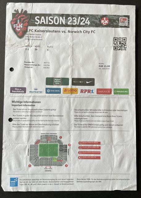 Match ticket, printed copy of electronic download (e ticket), for Norwich City’s away match against Kaiserlautern, in a friendly in 2023/4. (NWHHT:25607)
