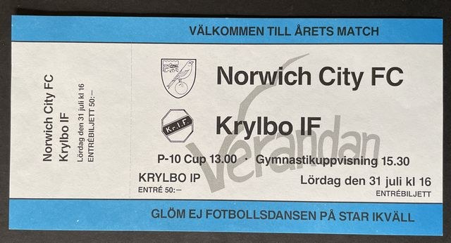 Match ticket for Norwich City’s away match against Krylbo Idrottsforening, in a friendly, in 1993/4. (NWHHT:21599)