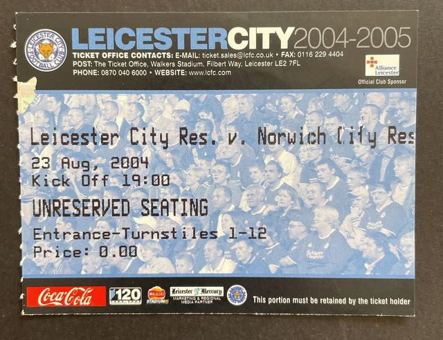 Match ticket from Norwich City’s reserves away match against Leicester City, in the Barlclays Premier Reserve League (South), in 2004/5. (NWHHT:27358)
