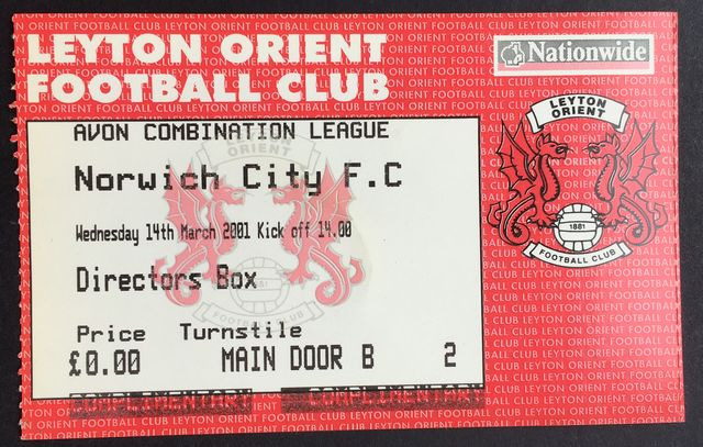 Match ticket, ‘Directors Box’, from Norwich City’s reserves away match against Leyton Orient, in the Avon Insurance Combination, Division One, in 2000/1. (NWHHT:20989)