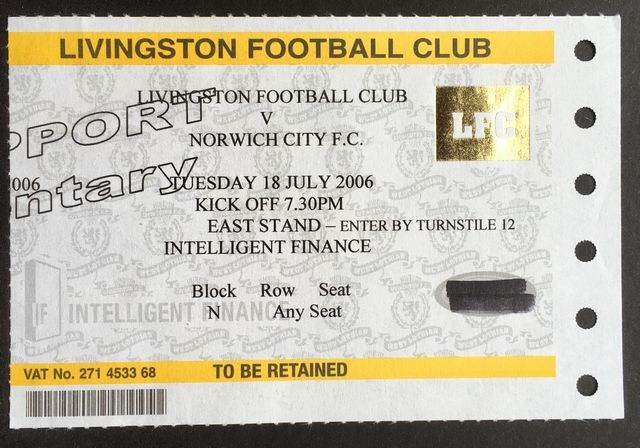 Match ticket from Norwich City’s away match against Livingston, in a friendly, in 2006/7. (NWHHT:20969)