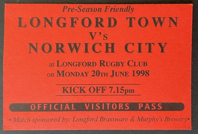 Match ticket, incorrectly dated 20 June 1998, for Norwich City’s away match against Longford Town, in a friendly, in 1998/9. (NWHHT:21882)
