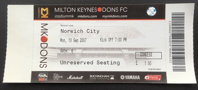 Match ticket from Norwich City’s reserves away match against Milton Keynes Dons, in the Pontin’s Holidays Combination, East Division, in 2007/8. (NWHHT:17652)