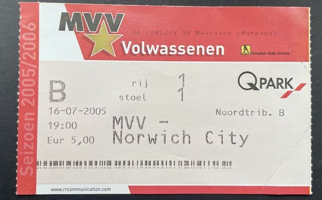 Match ticket for Norwich City’s away match against Maastrichtse Voetbal Vereniging Maastricht, in a friendly, in 2005/6. (NWHHT:21909)