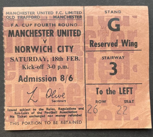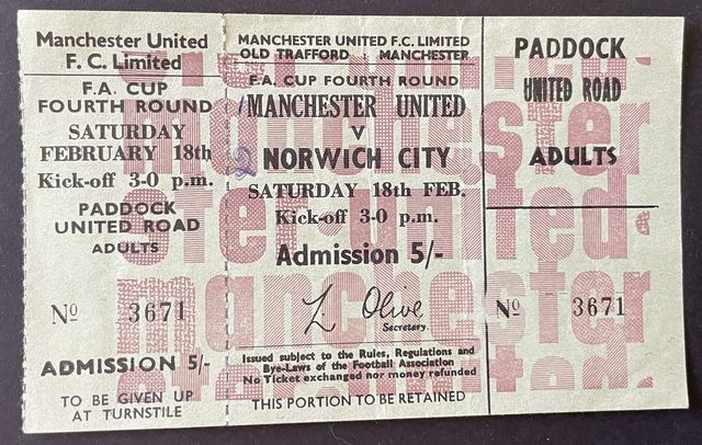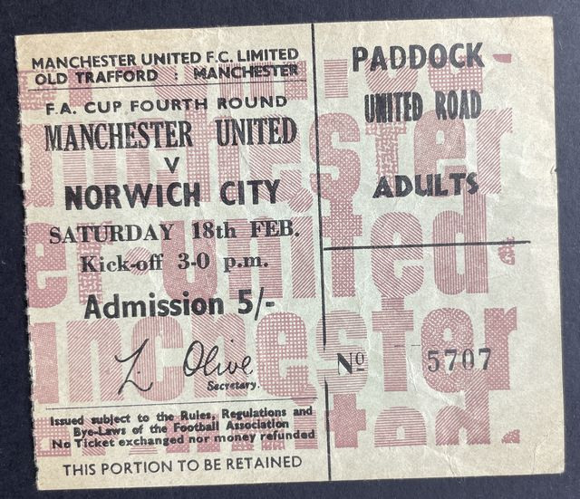 Match ticket, for ‘Paddock – United Road’ for Norwich City’s away match against Manchester United in the Football Association Cup, fourth round in 1966/7. (NWHHT:25785)
