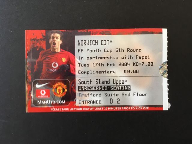 Match ticket from Norwich City’s youth away match against Manchester United, in the Football Association Youth Cup, fifth round, in 2003/4. (NWHHT:18069)