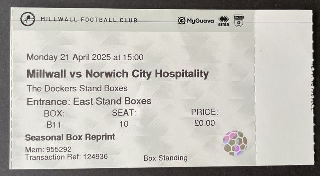 Match ticket, ‘Hospitality’, from Norwich City’s away match against Millwall, in the EFL Skybet Football League Championship, in 2024/5. (NWHHT:28452)