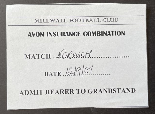 Match ticket from Norwich City’s reserves away match against Millwall, in the Avon Insurance Combination, Division One, in 2001/2. (NWHHT:27307)