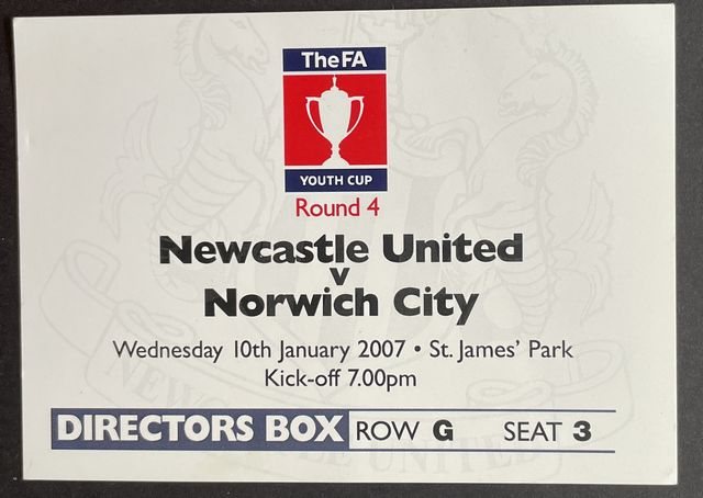Match ticket, ‘Directors Box’, from the Norwich City’s youth away match against Newcastle United, in the Football Association Youth Cup, fourth round, in 2006/7. (NWHHT:22886)