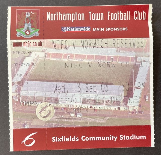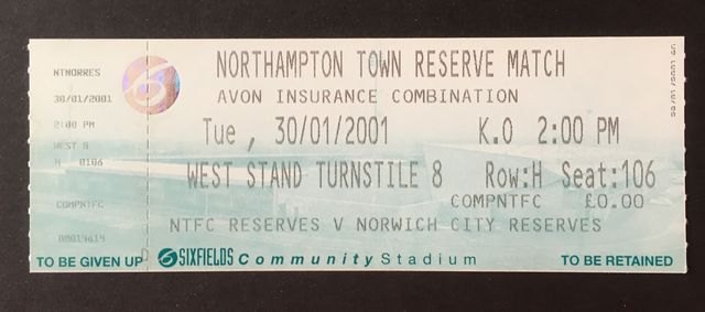 Match ticket from Norwich City’s reserves away match against Northampton Town, in the Avon Insurance Combination, Division One, in 2000/1. (NWHHT:18244)