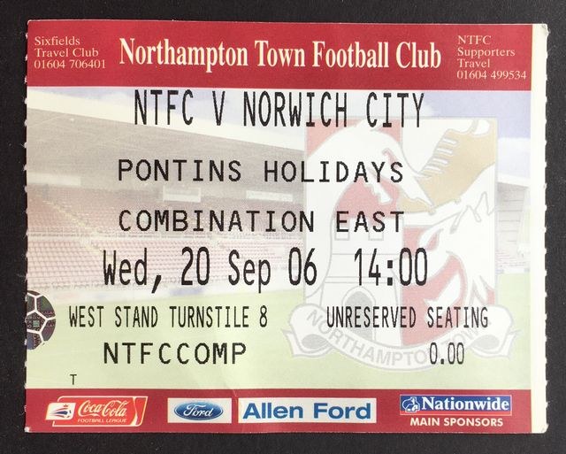 Match ticket from Norwich City’s reserves away match against Northampton Town, in the Pontin’s Holidays Combination, East Division, in 2006/7. (NWHHT:20967)