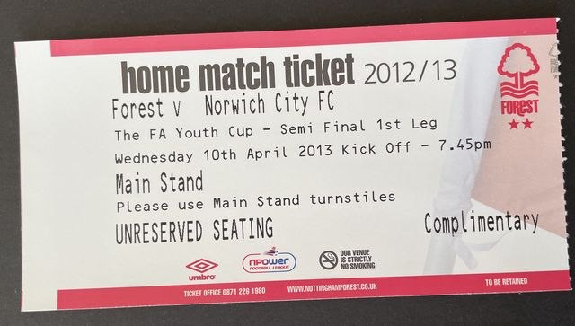 Match ticket for Norwich City’s youth away match against Nottingham Forest, in the Football Association Youth Cup, semi-final, first leg, in 2012/13. (NWHHT:21862)