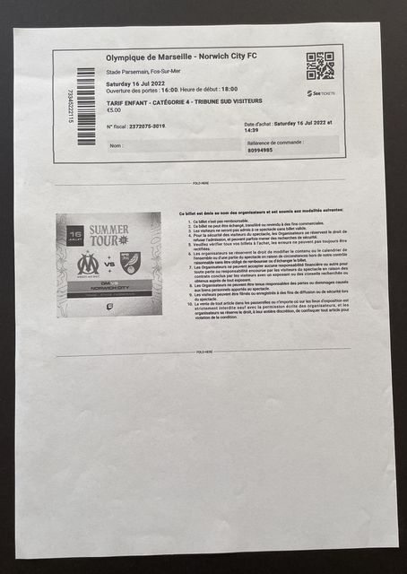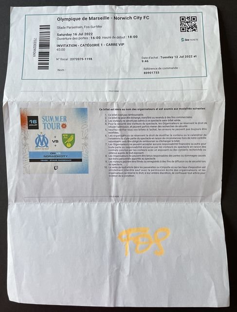 Match ticket, for a ‘VIP’, printed copy of electronic download (e ticket) for Norwich City’s away match against Olympique Marseilles, in a friendly in 2022/3. (NWHHT:23889)