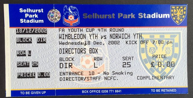 Match ticket, ‘Directors Box’, from Norwich City’s youth away match against Wimbledon, in the Football Association Youth Cup, fourth round, in 2002/3. (NWHHT:20975)
