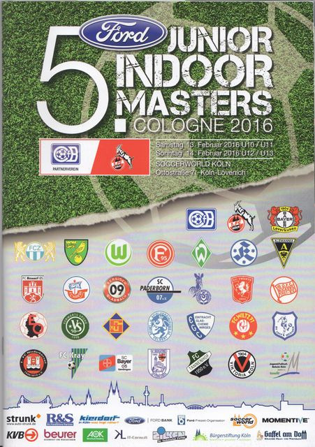 Match programme from the 5th Ford Junior Indoor Masters youth tournament, played in Cologne, Germany, in which Norwich City juniors in four groups from under 9’s to 13’s competed, in 2015/16. (NWHHT:9361)