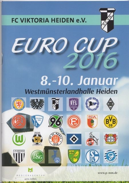 Match programme from the Euro Cup 2016 youth tournament, hosted by Viktoria Heiden 1921, played in Germany, in which Norwich City under 12’s competed, in 2015/16. (NWHHT:9369)