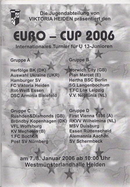 Match programme from the Euro-Cup tournament 2006, played at Heiden,Germany, in which Norwich City under 13’s competed, in 2005/6. (NWHHT:7287)