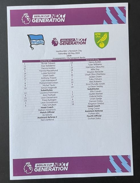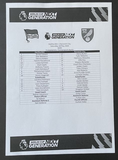 Match programme from the 2004 Young Talents Cup tournament, played at Hertha Berliner Sport Club, Germany, in which Norwich City Juniors competed, in 2003/4. (NWHHT:6918)