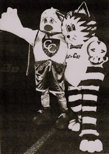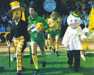 In August 1995 what used to be called ‘watching the Reserves’ became ‘Family Night Football’. A large, costumed character was introduced to attract children to matches. Captain Canary had been interviewed and appointed. He waddled slowly about in unfeasibly large boots, and it was decided to seek a more agile accomplice. A large yellow and blue cat called Splat arrived on 4 October 1995. (We lost that one 5-1 but he kept coming back.) He was agile, springy, and able to tumble over his own feet in an entertaining way. Players were told they shouldn’t mind having their hair ruffled just before appearing on camera. He was memorable.